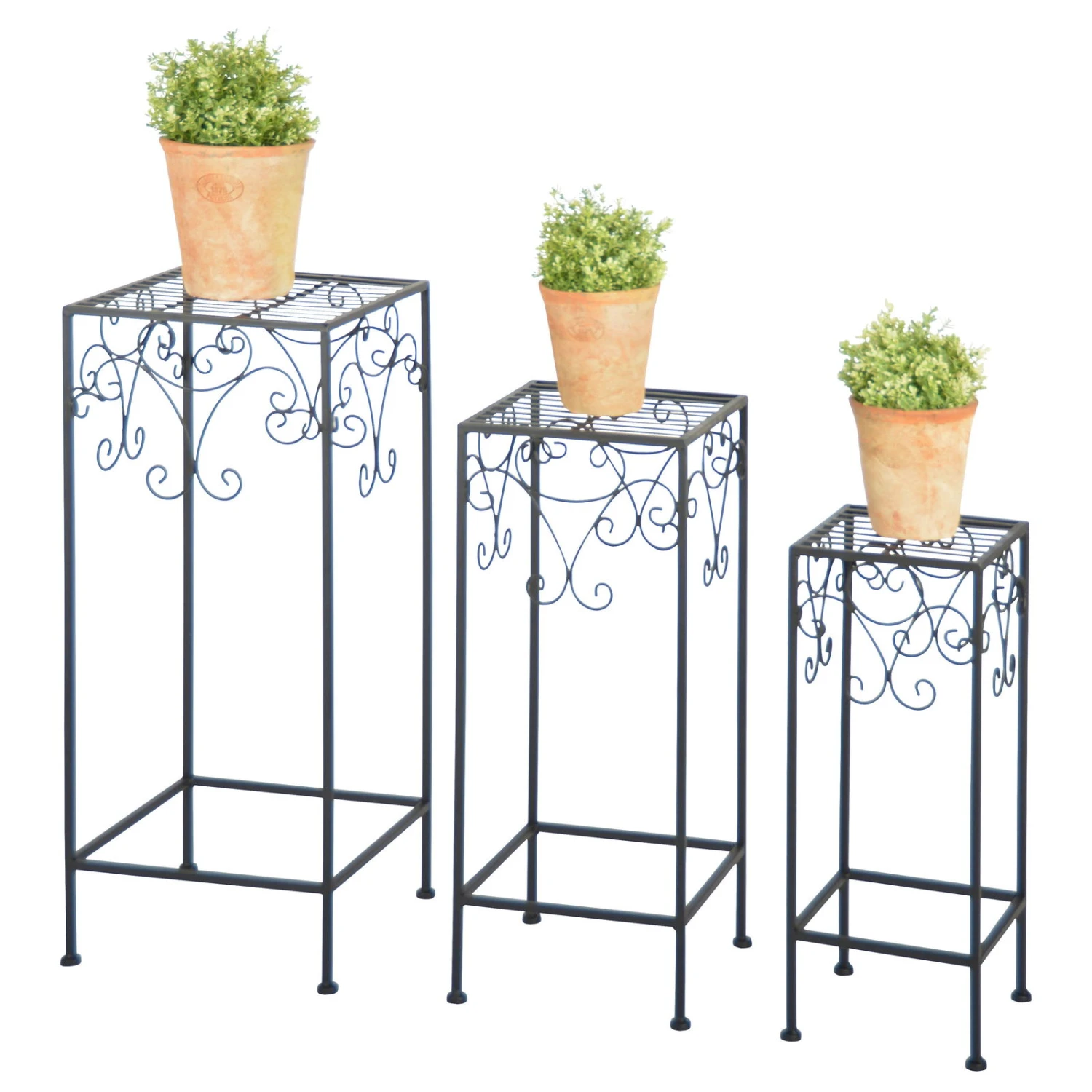 Sie erhalten die dekorativen Pflanztische in einem vorteilhaften 3er-Set, um Ihre wertvollen Zierpflanzen gekonnt in Szene zu setzen. Die Pflanztische aus robustem Metall machen im Innen- und Außenbereich eine ausgezeichnete Figur und brillieren mit ihrem filigranen Design in nahezu jedem Raumkontext. Zum Gestalten von saisonalen Arrangements sowie für Blumenvasen sind die Pflanztische ebenfalls die richtige Idee.