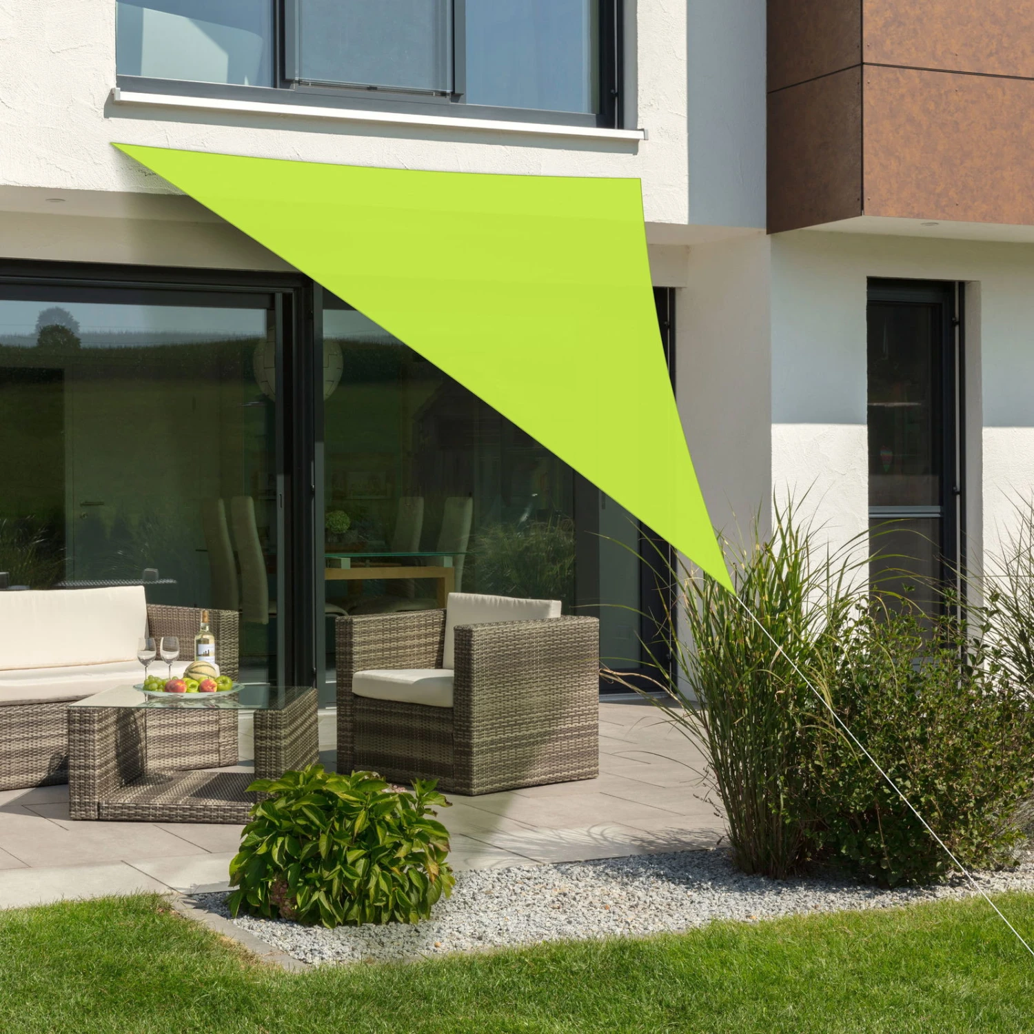 Das Sonnensegel ‚Lanzarote‘ von Schneider Schirme präsentiert sich in sympathischer Farbe Apfelgrün und lässt auf Ihrem Balkon, Campingplatz oder Ihrer Terrasse eine kühle, schattige Oase entstehen. Sie erhalten das Sonnensegel zusammen mit einem rund 10 Meter langen Befestigungsseil. Für mehr Sicherheit und eine einfache Handhabung ist das Sonnensegel mit Edelstahlösen und einem doppelt vernähten Saum ausgestattet.